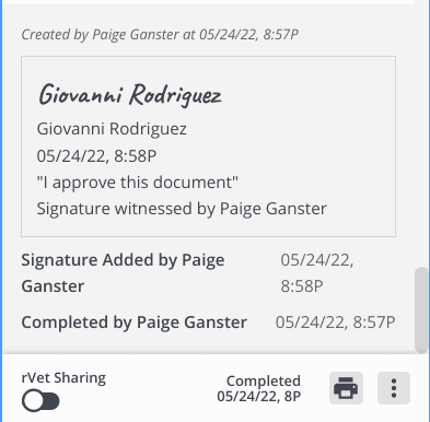 The pet owner types in their name and checks a box indicating they understand this signature is legally binding. Their signature is dated and time stamped. In addition, the Instinct user is logged as a witness to the signature. All this information is securely stored and trackable.