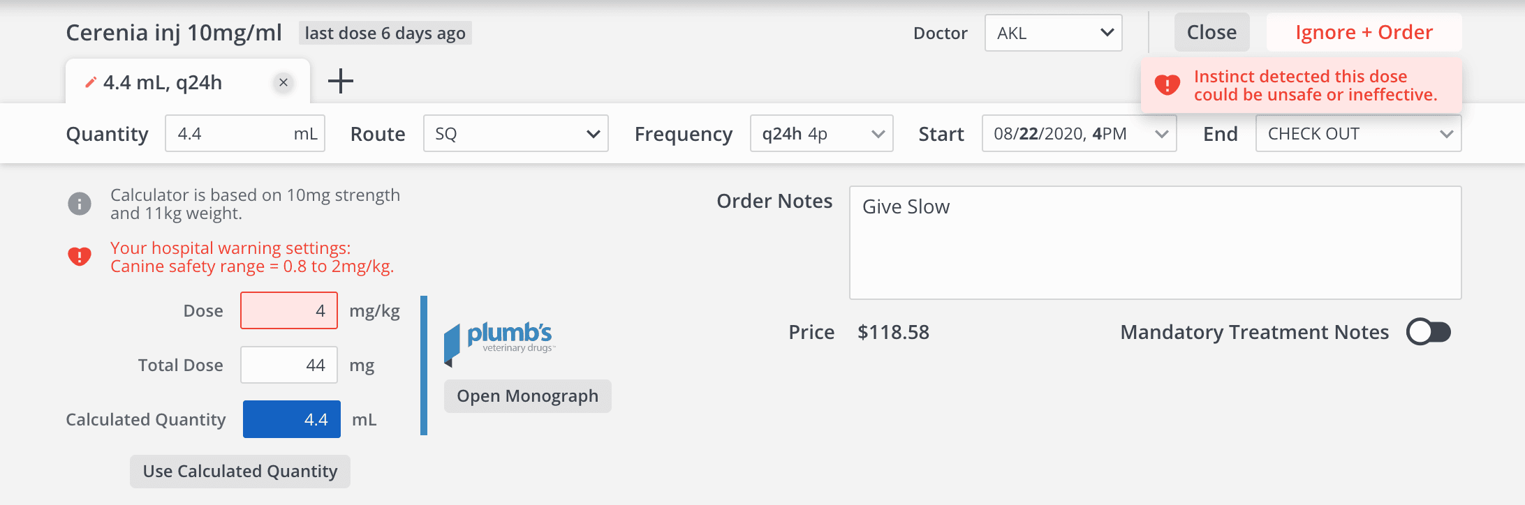 Speaking of safety, Instinct offers several helpful tools for high-quality patient care, including patient safety warning systems, smart calculators, and integration with Plumb’s Veterinary Drugs, which is extremely helpful for teaching hospitals.