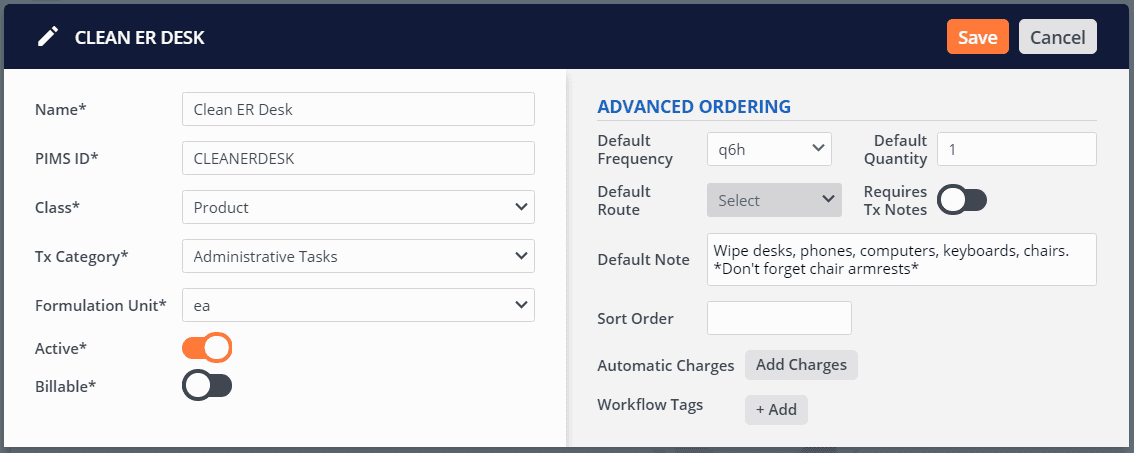 Step 2: Create a few non-billable products to use in the checklist (ie, βClean ER Areaβ). Iβve included a screenshot of the settings weβd recommend (see below). Donβt forget to set a default frequency and quantity to help the team work quickly. In the default notes, place instructions to remind the team what to do for each checklist item.