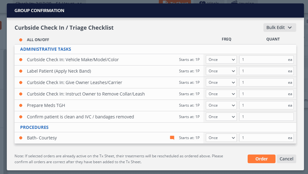 One easy way to streamline these check-in changes is to create a simple checklist for your triage and front desk team. Once the patient checks in, order it on the treatment sheet, and go. Now the whole team knows whatβs been done and what hasnβt been done, and youβve set up reminders for every step along the way.