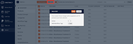 In Instinct Treatment Plan, our users love utilizing the Bulk Edit tool to quickly mark a collection of products inactive or add Workflow Tags to optimize Status Board filtering. Just search for the Products you want to update, check the orange box, and select Bulk Edit at the top of the screen!