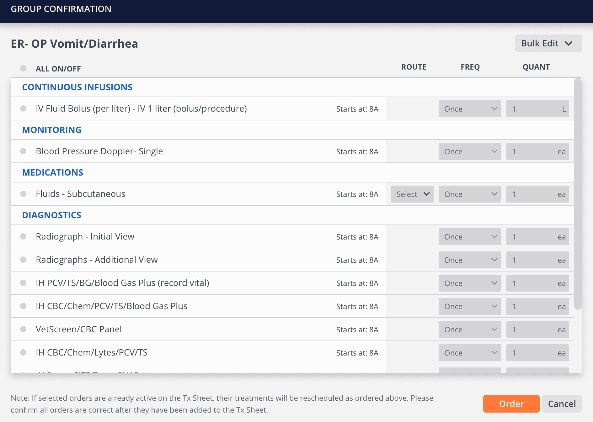Quickly order an outpatient vomit/diarrhea workup using groups. This ensures nurses and assistants have clear instructions to take over while the doctor tends to other patients.